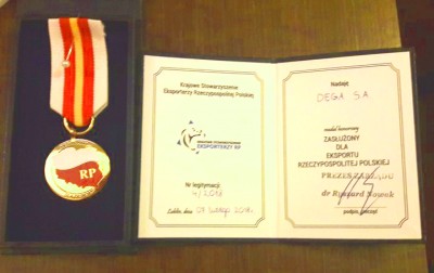 Podczas tegorocznej Gali Eksportu DEGA S.A. otrzymała Medal Honorowy jako firma zasłużona dla eksportu Rzeczypospilitej Polskiej.Uroczysta Gala odbyła się w dniu 7 lutego w Centrum Kongresowym UP w Lublinie, nagrody wręczał Wiceminister Tadeusz Kościński Podsekretarz stanu w Ministerstwie Przedsiębiorczości i Technologii.