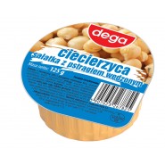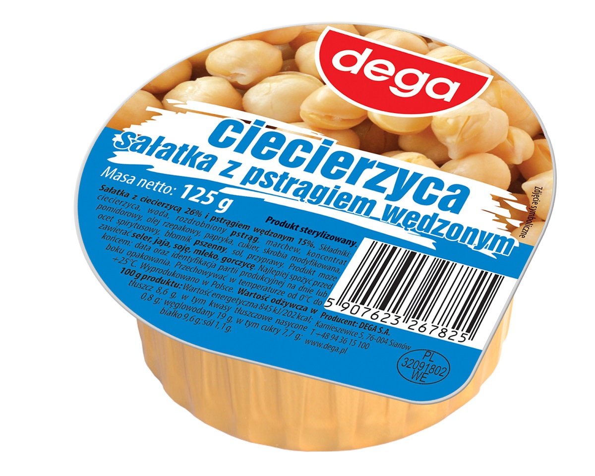Sałatka z ciecierzycą 26% i pstrągiem wędzonym 15%. Główne składniki to ciecierzyca, rozdrobniony pstrąg, marchew, przecier marchwiowy, koncentrat pomidorowy, olej rzepakowy, papryka, przyprawy. Produkt sterylizowany. Może zawierać seler, jaja, soję, mleko, gorczycę.