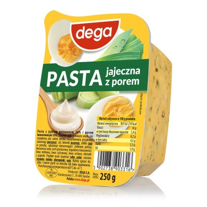 Nowość w ofercie DEGA. Pierwszy taki produkt w Polsce. Aromatyczna, jajeczna i kremowa pasta do smarowania pieczywa. Wysoka zawartość jajka, polski olej rzepakowy i aromatyczna nuta przypraw – to idealne połączenie składników. Charakteru nadaje dodatek pora. Dobrze smakuje również z naleśnikami, z pieczywem chrupkim, tortillą i warzywami.