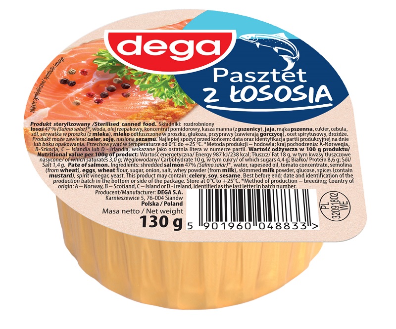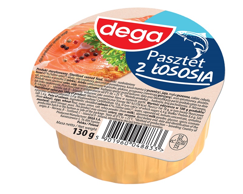 Pasztet którego głównym składnikiem jest łosoś (44%) oraz koncentrat pomidorowy, kasza manna, jaja, przyprawy. Produkt sterylizowany. Może zawierać seler, soję, gorczycę.