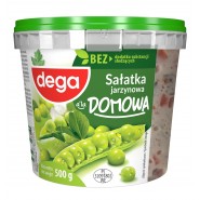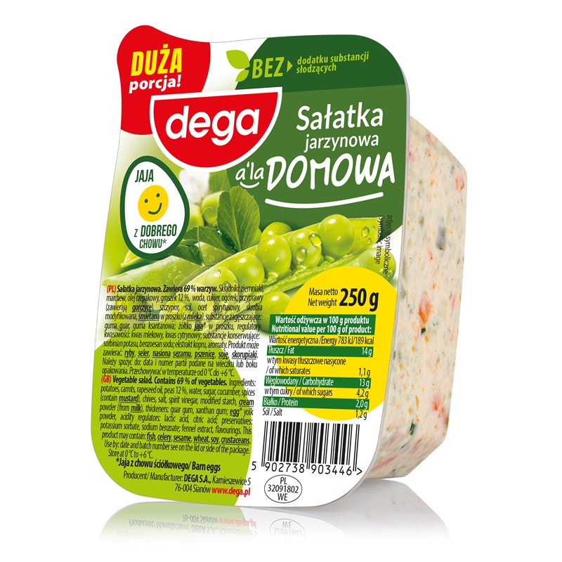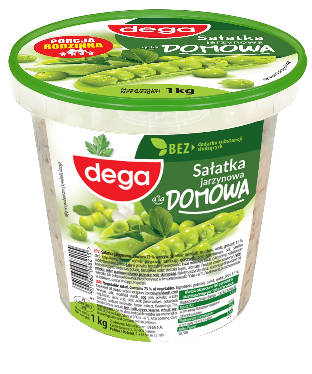 Ulubiona sałatka Polaków od wielu lat! Napełniona warzywami - aż 69%. Tradycyjne i sprawdzone składniki: ziemniaczki, marchewka, groszek, seler i majonez tworzą pyszną kompozycję. Hit sprzedaży doceniany przez Konsumentów. Tradycja DEGA od ponad 25 lat!