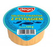 Wyrazista, pikantna sałatka na bazie mięsa z pstrąga oraz kompozycji warzyw takich jak cebulka, marchew, pietruszka. Propozycja z charakterem dla amatorów lekko pikantnych potraw. Unikatowa receptura DEGA.
