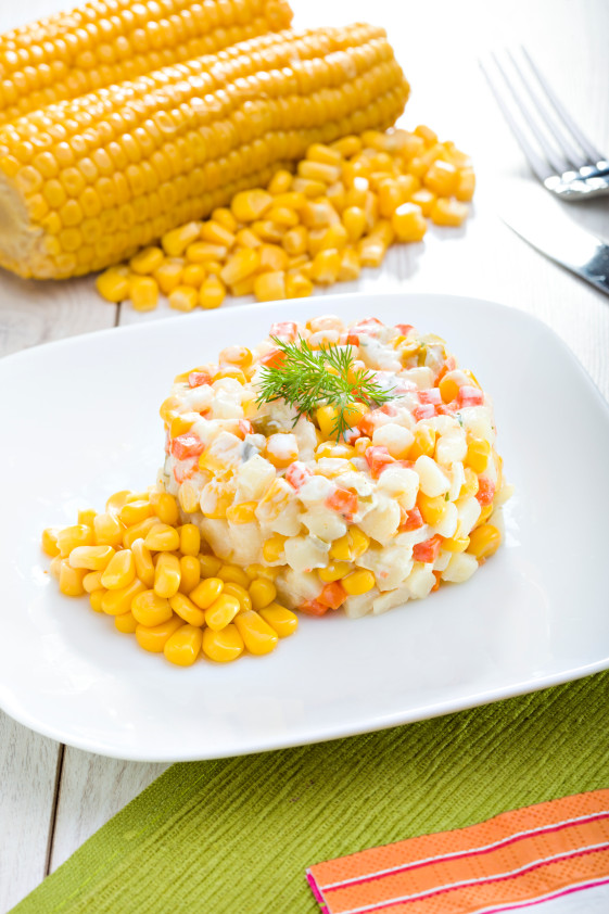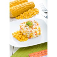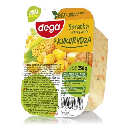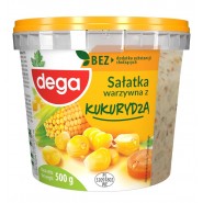 Sałatka warzywna z kukurydzą z dodatkiem ziemniaków, marchewki, ogórka, i cebuli. Wszystkie warzywa doprawione i połączone majonezem. Produkt może zawierać mleko, seler, sezam.