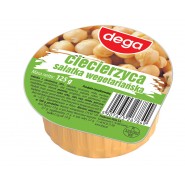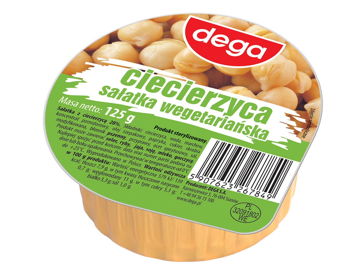 Sałatka z ciecierzycą z dodatkiem marchwi, przecieru marchwiowego, koncentratu pomidorowego, oleju rzepakowego, papryki oraz przypraw. Produkt sterylizowany. PMoże zawierać ryby, seler, jaja, soję, mleko, gorczycę.
