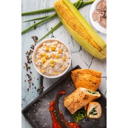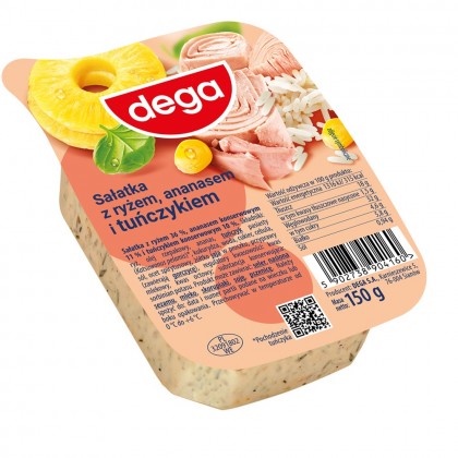 Nowość w ofercie Dega. Wysokiej jakości gotowany biały ryż to doskonała baza sałatki i świetnie się sprawdza w połączeniu z wysokiej jakości tuńczykiem. Słodki ananas i kukurydza doskonale łączą się z rybką i ryżem. Sałatka pasuje jako samodzielny posiłek ale również jako dodatek do nachos i grissini. Unikatowa receptura Dega.